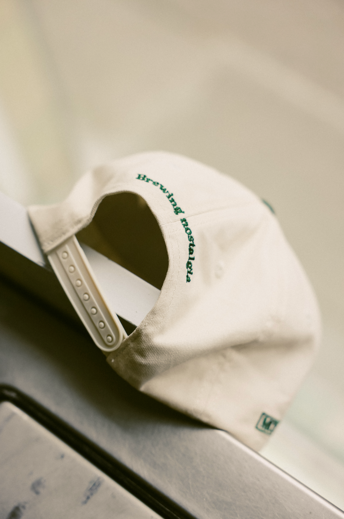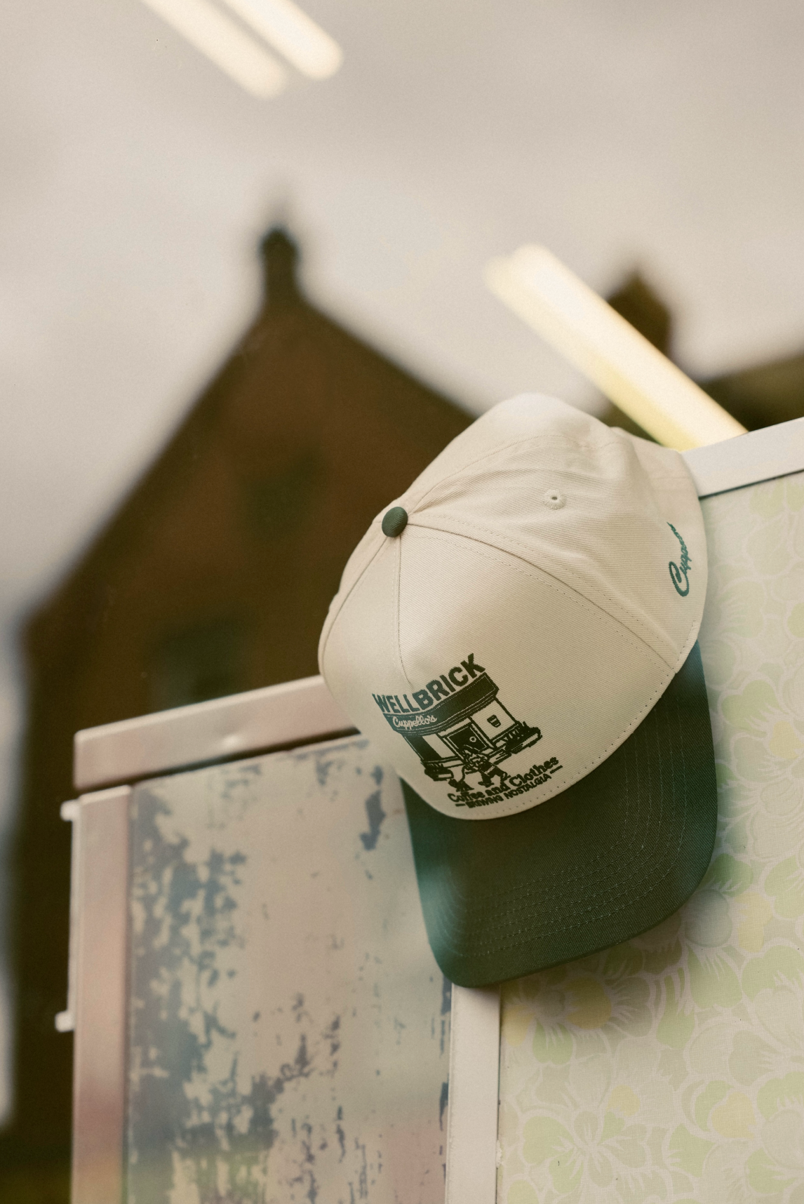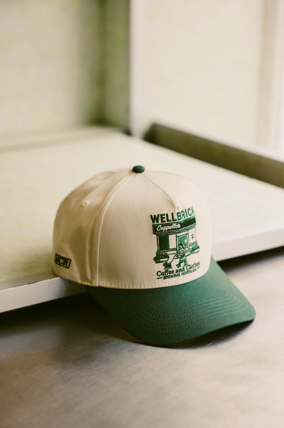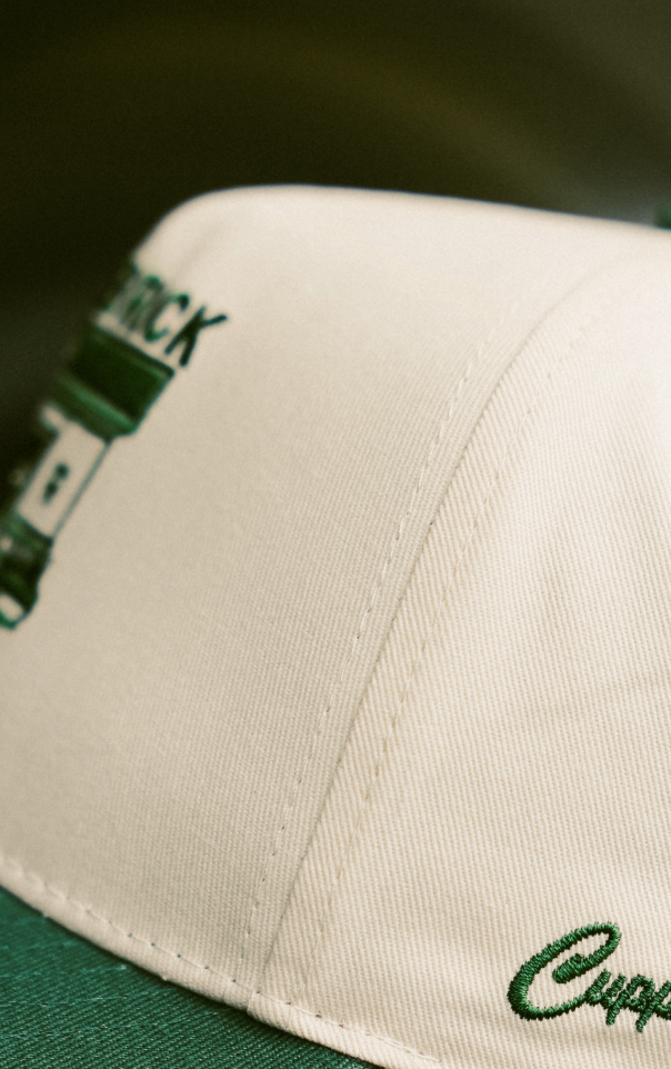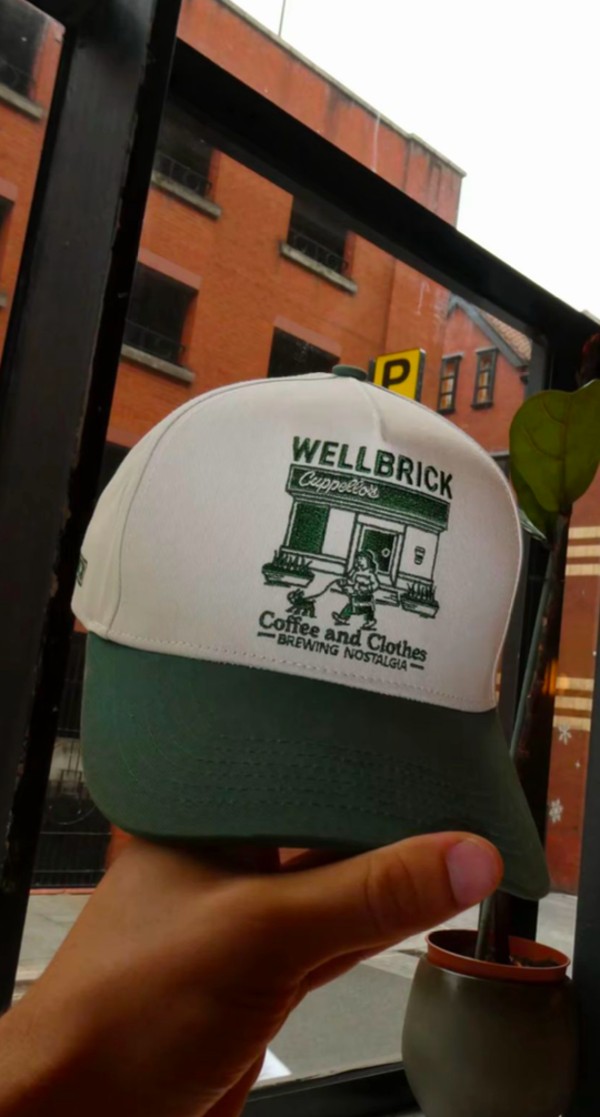 The front features embroidered artwork of the Cuppellos storefront, a nod to their hole-in-the-wall coffee spot, while the back carries the Brewing Nostalgia slogan. Finished in a nostalgic cream crown with deep green peak, the cap ties together everyday wearability with a community-first story.